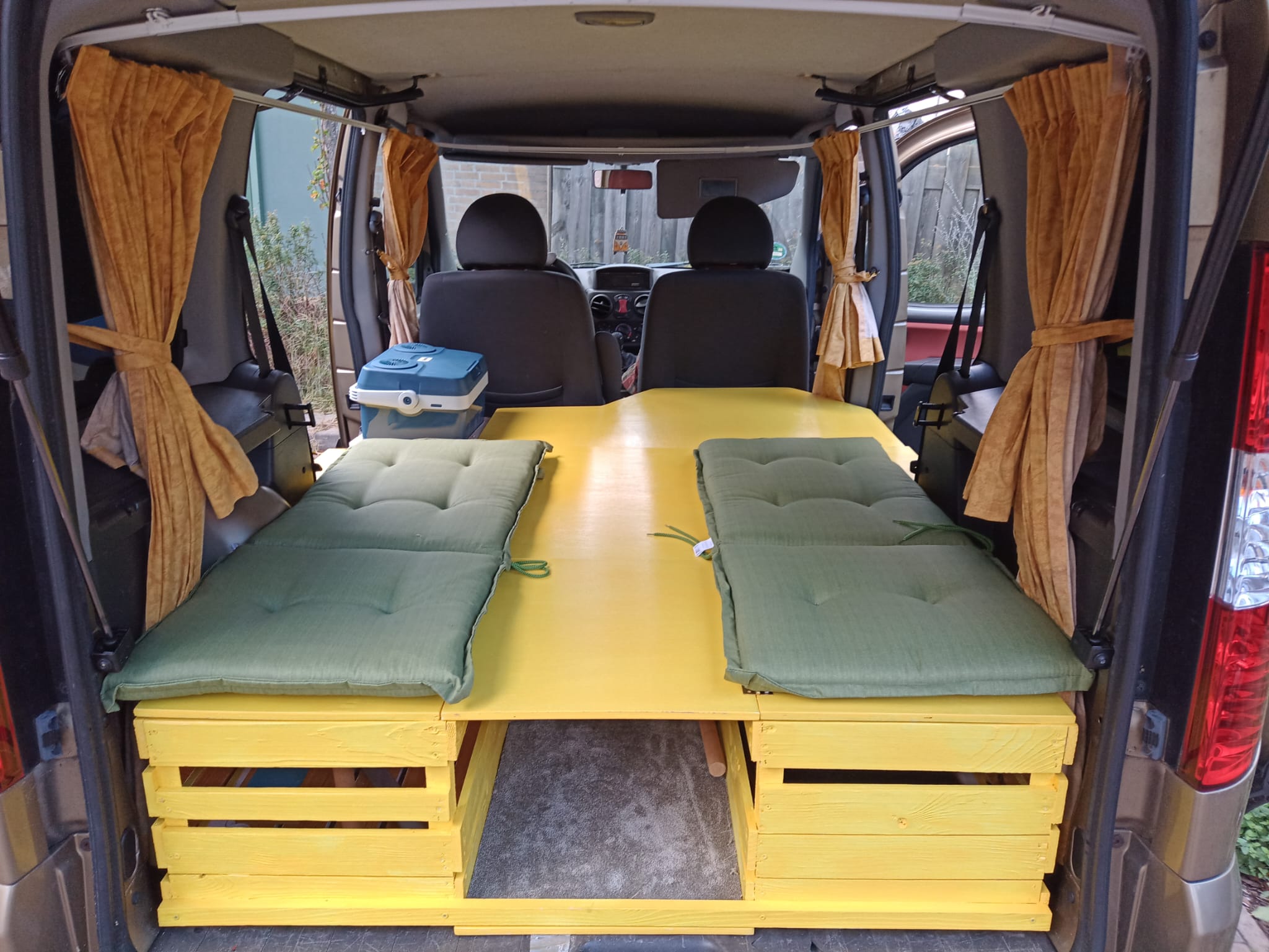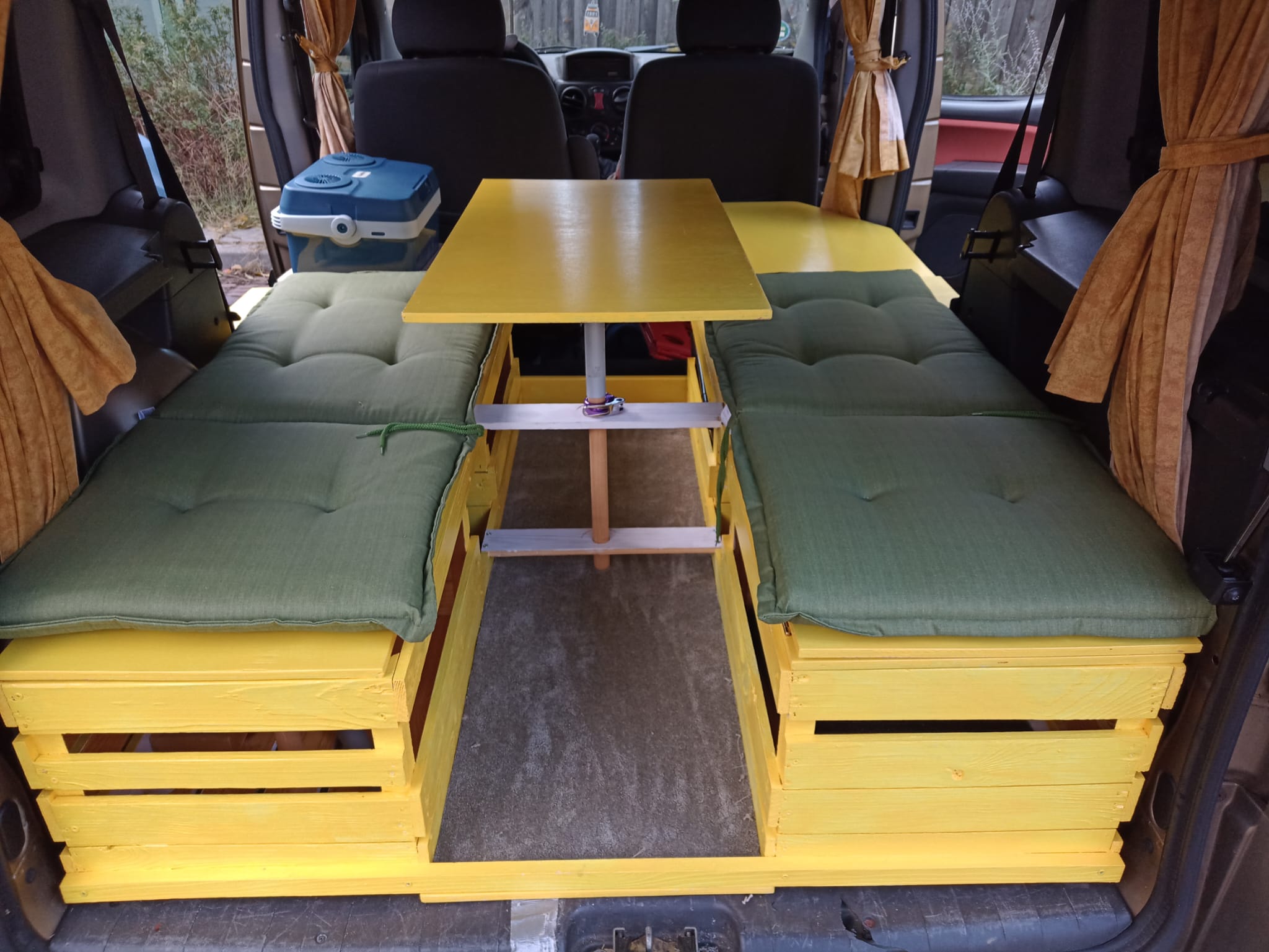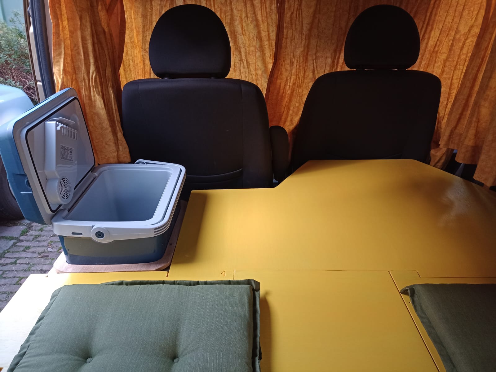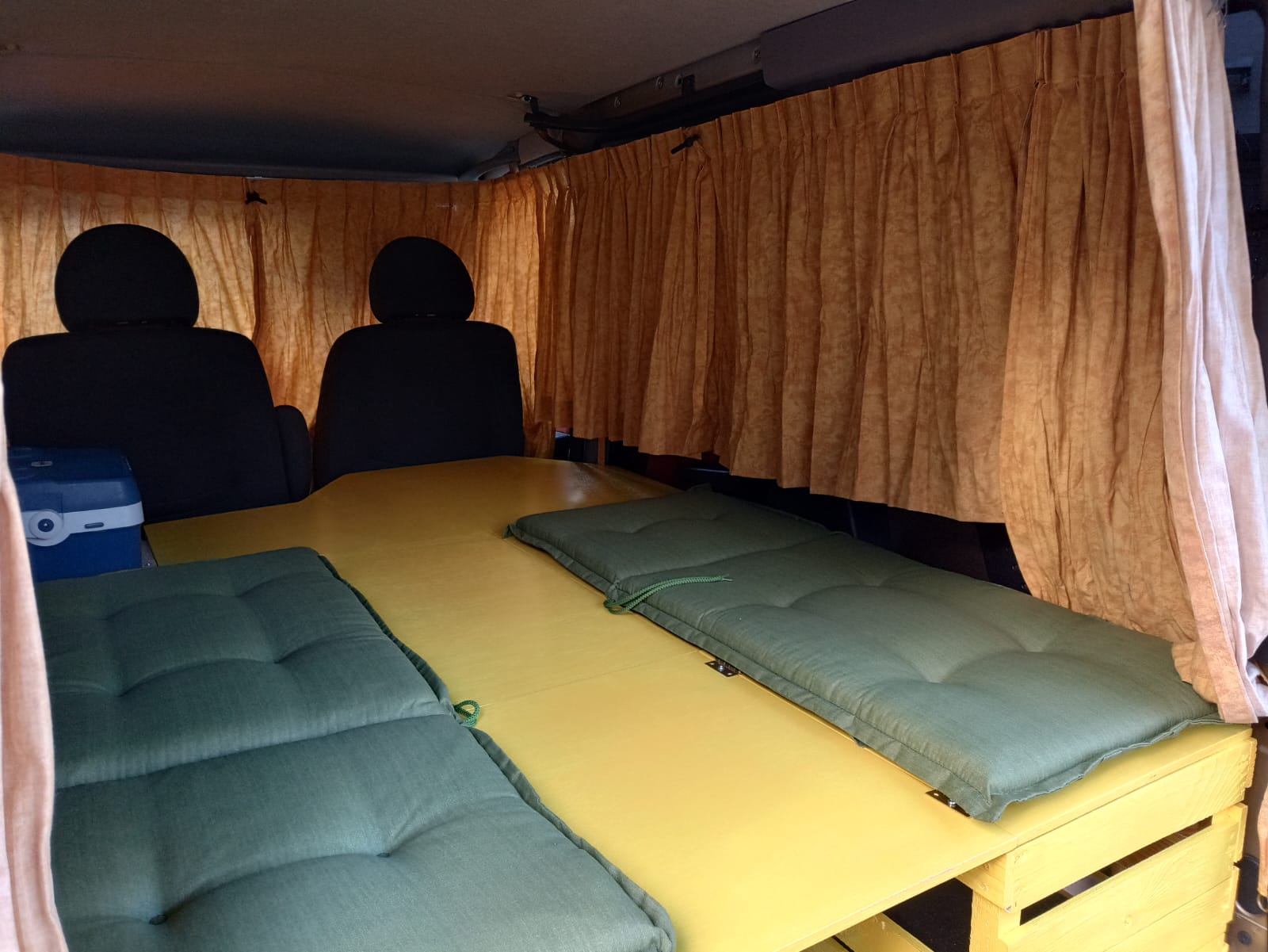 De matras is een opdek matras en komt op de kussens te liggen. Opbergen van de matras tijdens stilstand is opgerold op de voorstoelen.