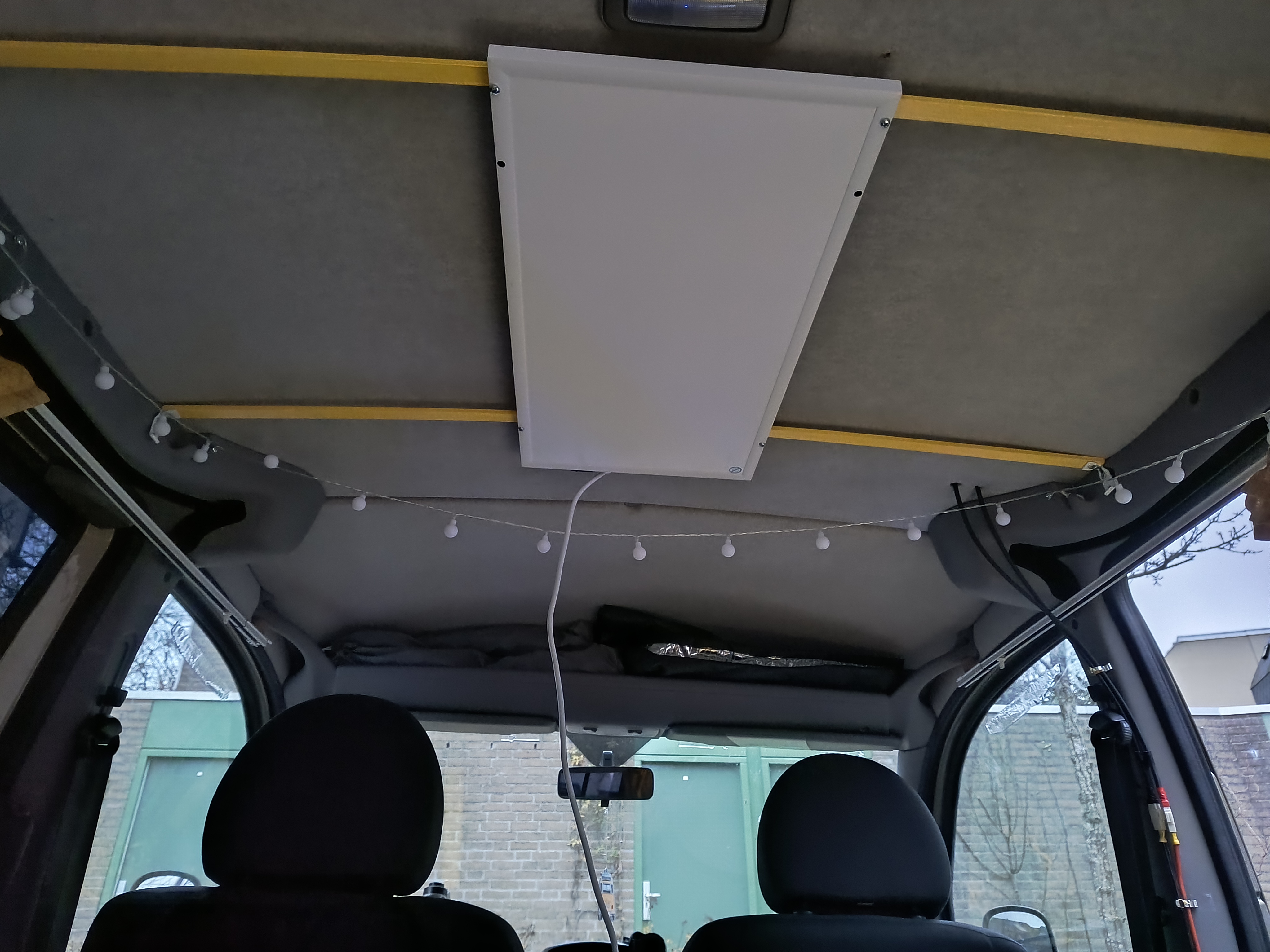 Aan het plafond hangt een infra-rood paneel voor de verwarming. Deze gebruikt ongeveer 120Watt. Niet genoeg om hele koude dagen te compenseren maar het doet wel wat!