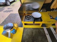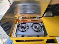 Koken doe ik op gas. Ik heb geen waterpomp maar een jerrycan met een kraantje. Wellicht ga ik ook m'n "douche-zak" gebruiken (maar ook dat kan eenvoudig met een 1,5 literfles met