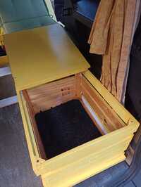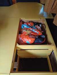 SlapenDe fruitkistjes en de ruimte in het "middenpad" worden afgesloten met deksels. Een extra stuk voor het voeteneind zorgt voor een comfortabele lengte.