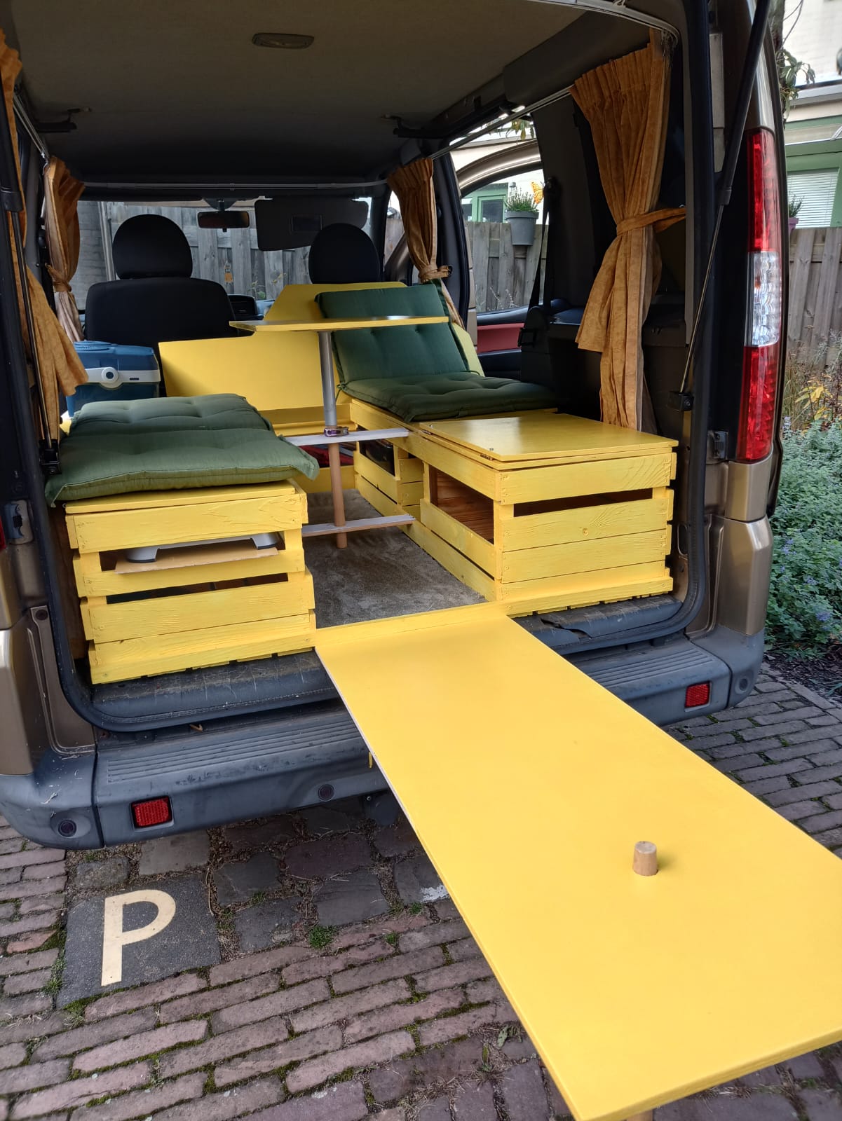 De vloer tussen de fruitkistjes kan naar buiten getrokken worden en doet dan dienst als tafel.