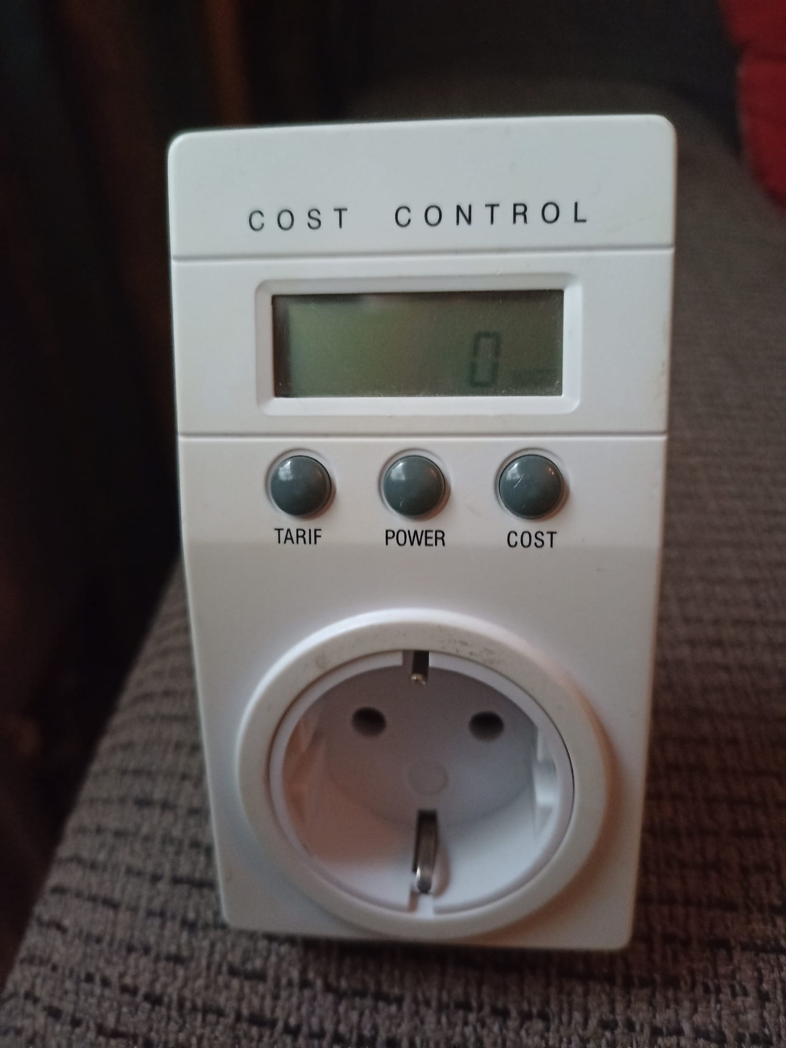 Verbruik in kaart brengenVoordat je allerlei apparatuur als een accu, zonnepaneel, omvormer en laadregelaar gaat aanschaffen is het handig je te verwachten gebruik in kaart te brengen. Bij het uitzoeken van het gebruik heb ik gebruik gemaakt van dit apparaatje ("cost control") wat ik ooit eens had aangeschaft:
