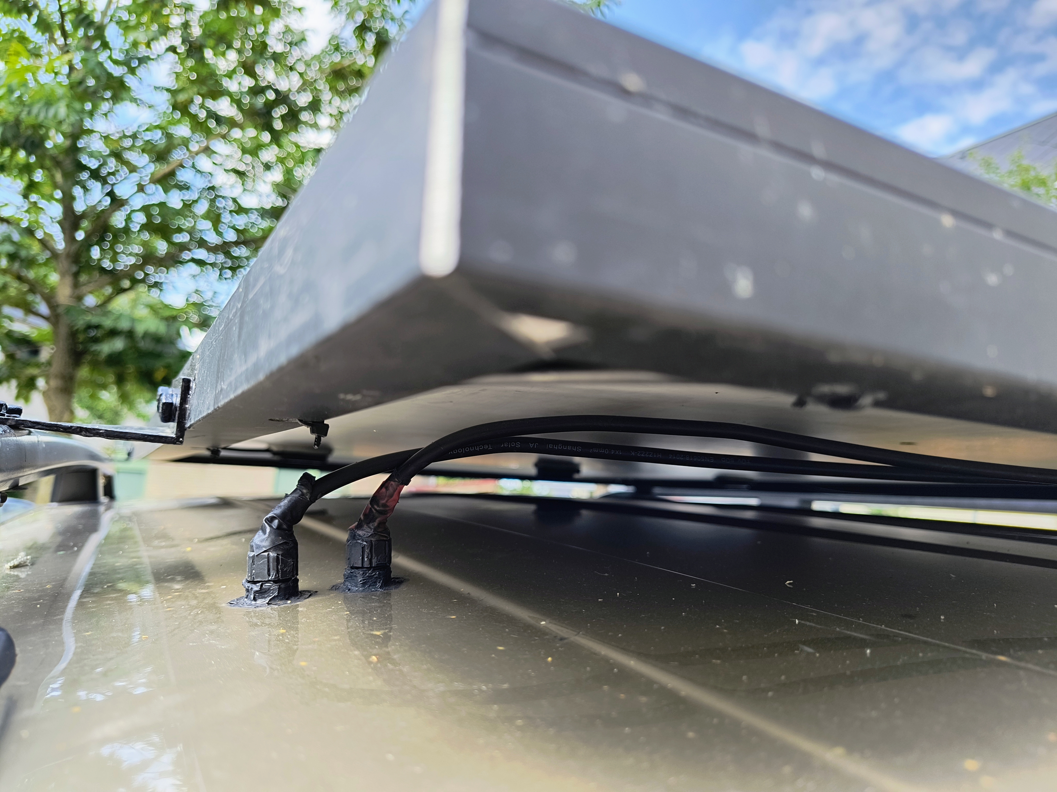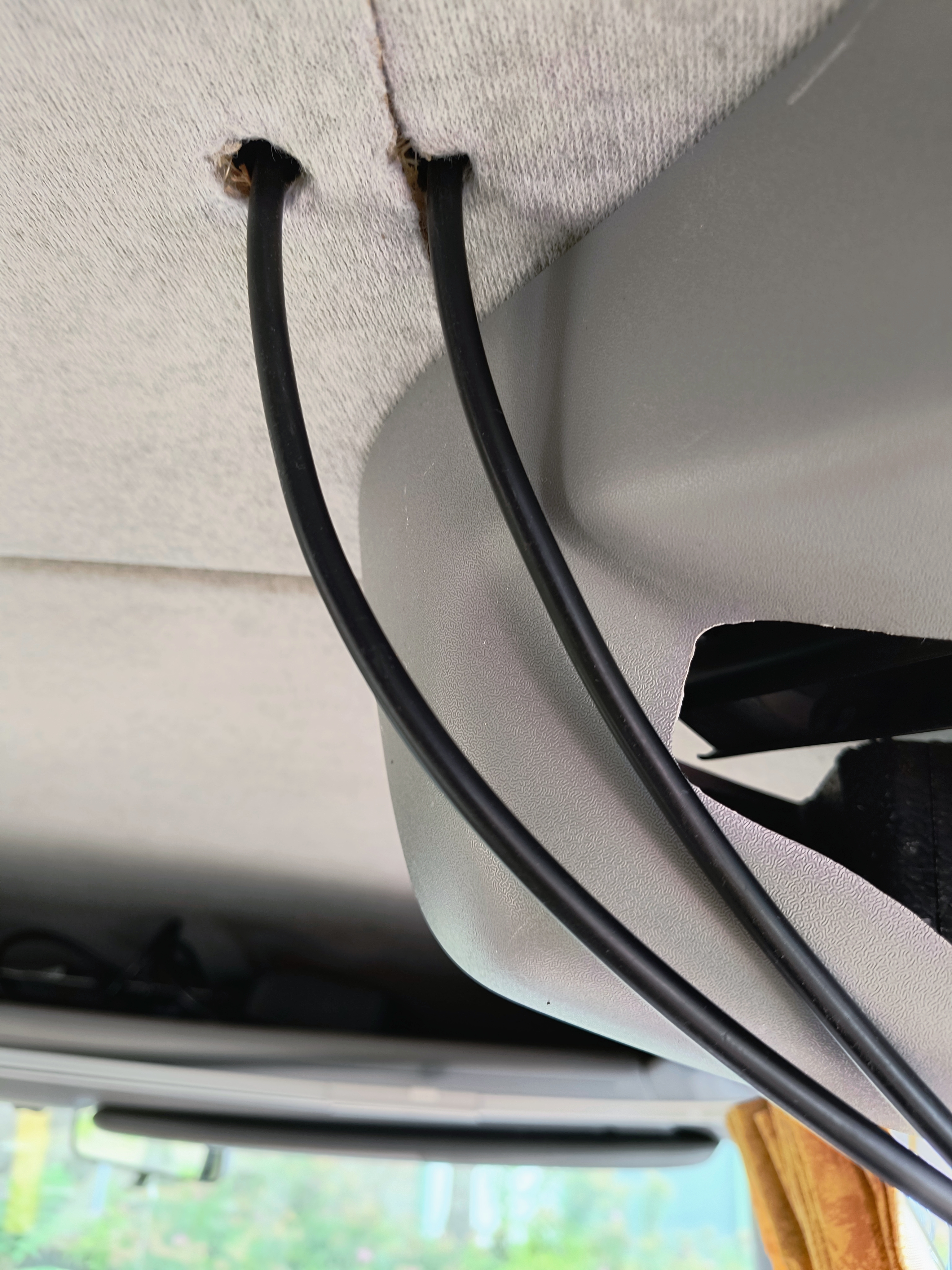 Ik ontkom er niet aan om 2 gaatjes voor de 2 kabels van het paneel in het autodak te boren.