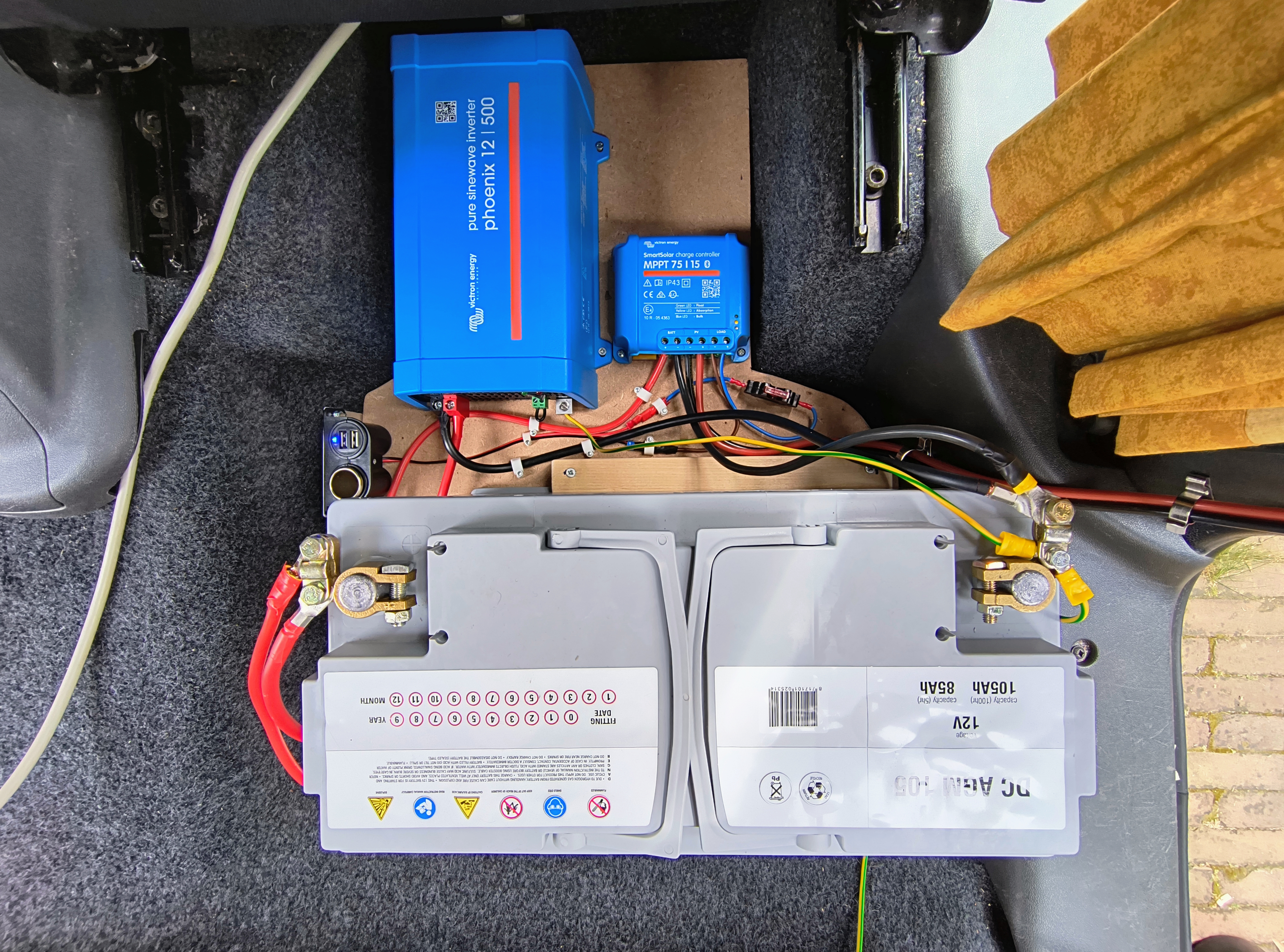OmvormerAls alles in gebruik is wordt er zo'n 48 + 130 = 178 Watt gevraagd. Rekening houdend met pieken en eventuele extra's is een 12 naar 230 volt omvormer van max 500 Watt ruim voldoende. Ik heb voor de Victron 12/500 gekozen. Deze heeft ook een piekvermogen van 900 Watt, ook ruim voldoende dus.