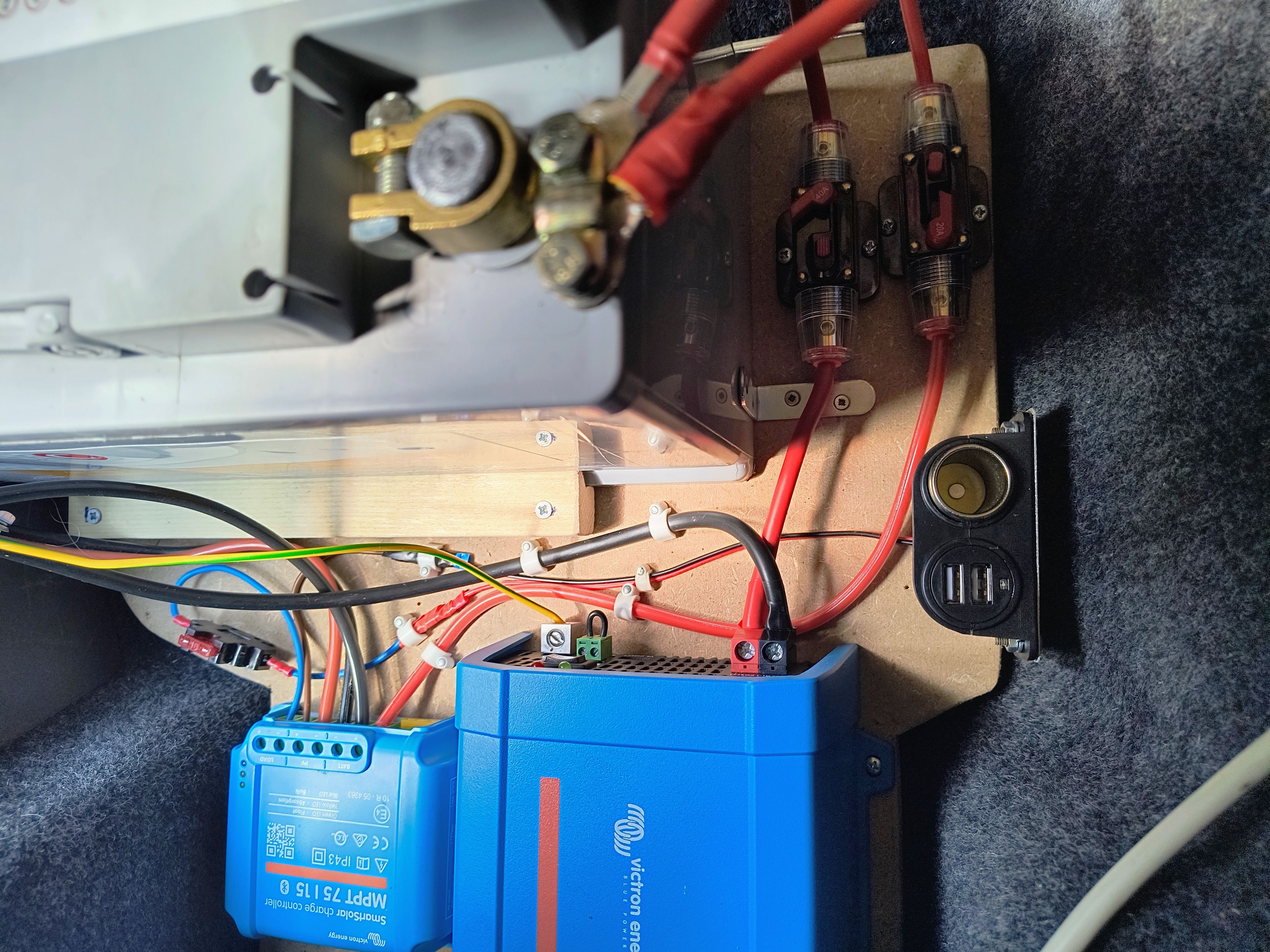 De MPPT 75/15 heeft een 20A zekering ingebouwd. Toch ook hier een zekering (20A) ingebouwd aan de plus van de accu, er zit tevens een schakelaar op zodat ik het paneel makkelijk kan uitschakelen.