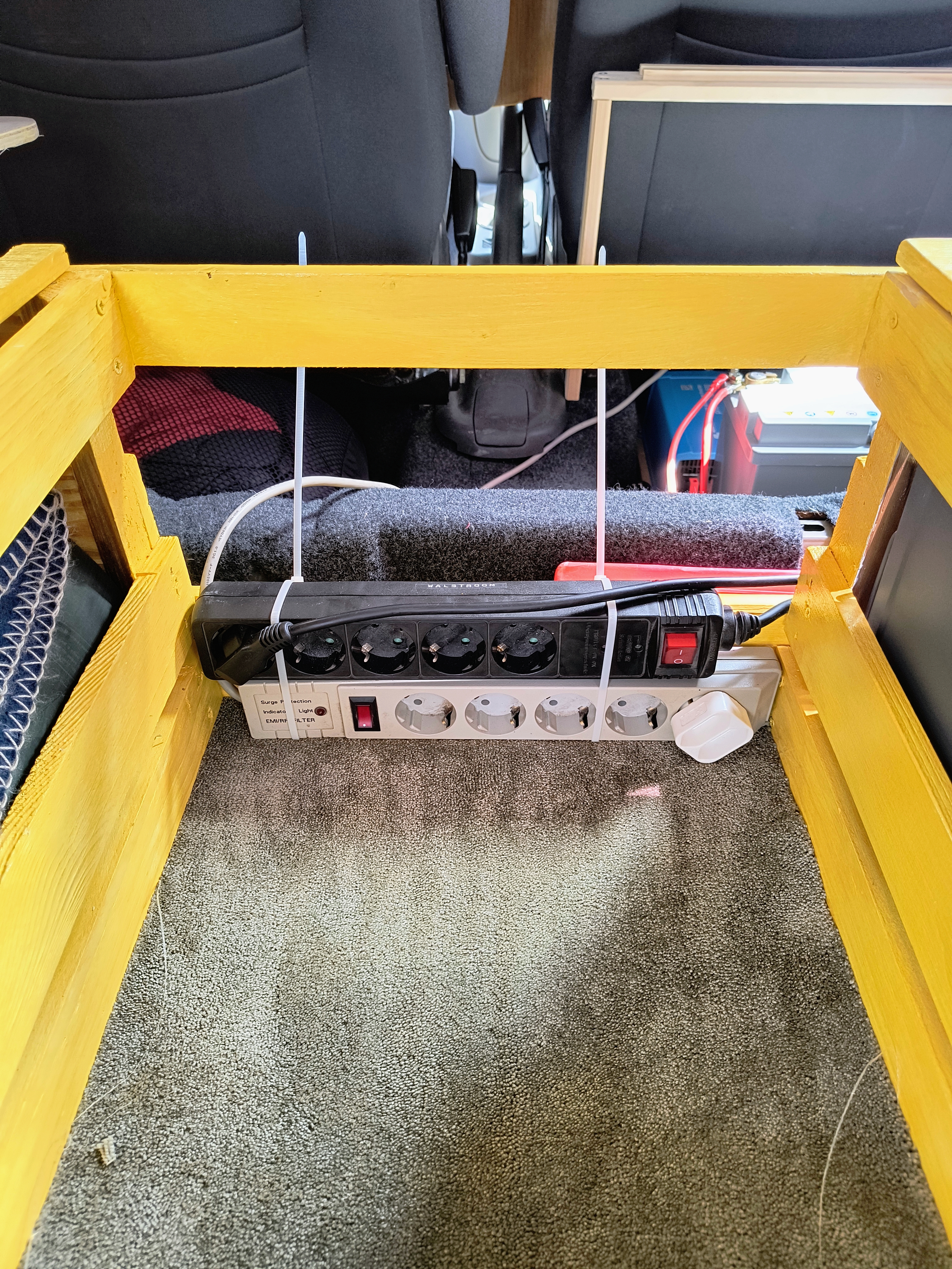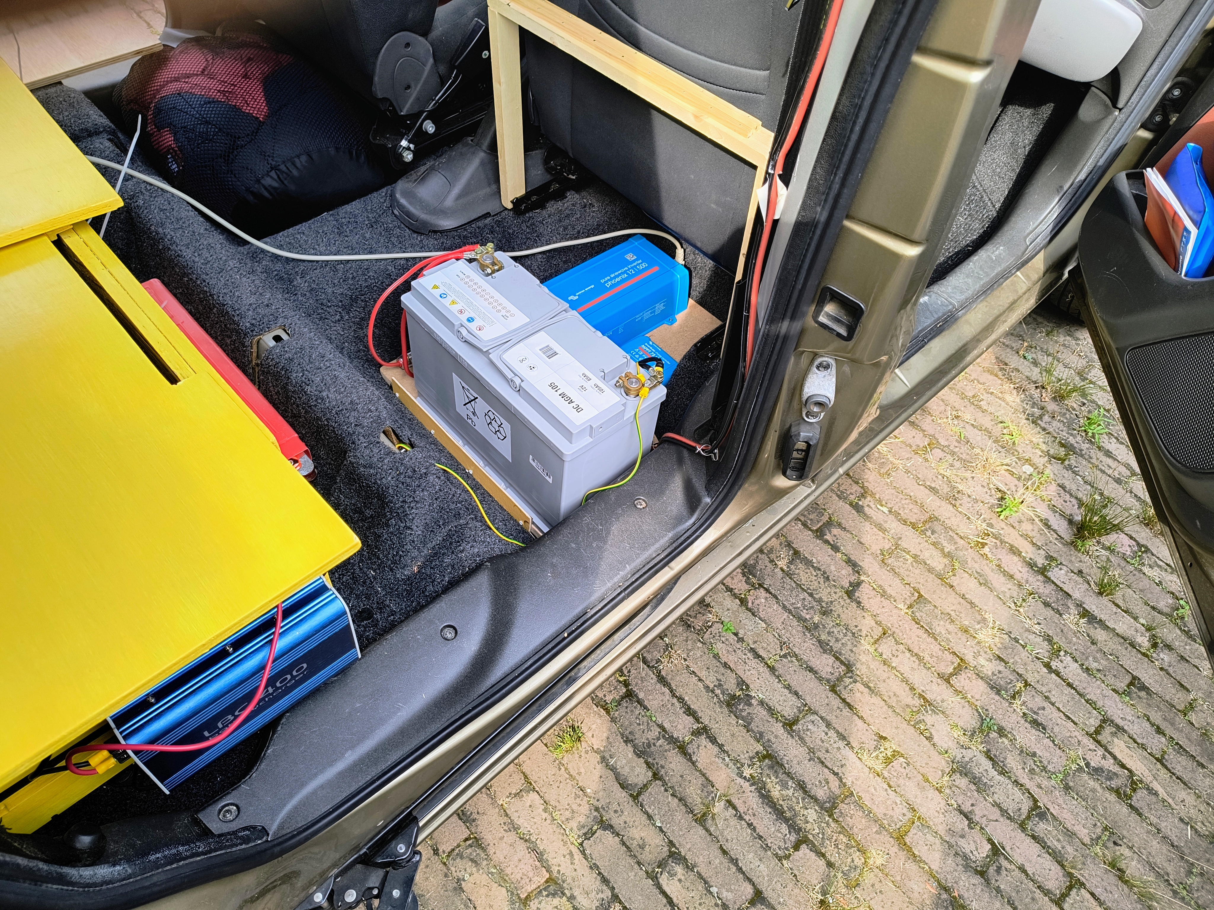 Achter de bestuurdersstoel is de 12V/220V koelkast geplaatst.